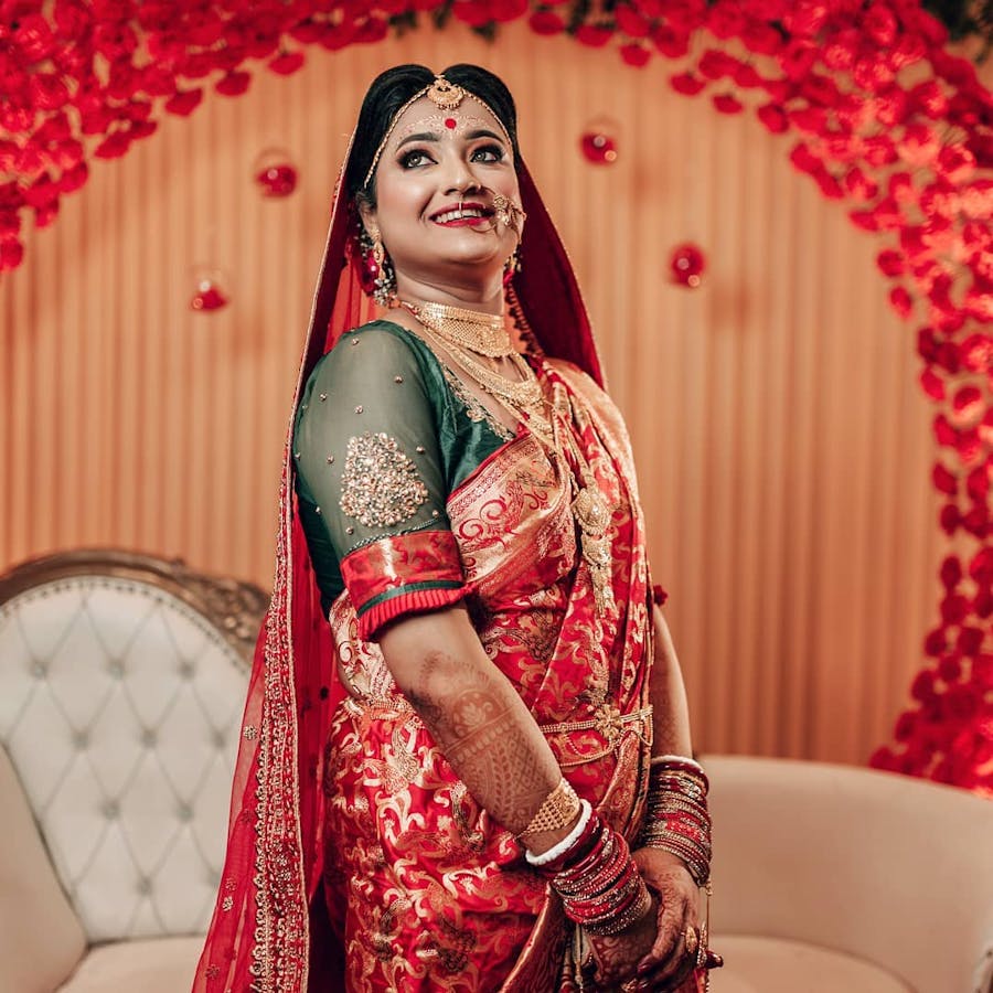 Benarasi sarees make the ultimate choice of bridal wear among the bong brides. And there are certain types of benarasi sarees that are timeless pieces in the Bengali bridal fashion book. Just like this bespoke benarasi saree in a peachy red shade. The intricate golden benarasi thread work all over the body of the saree is indeed the centre of attraction. The rosette and creeper motif benarasi saree is well paired with a matching designer blouse and minimalist makeup. Pure bong minimalist beauty.
