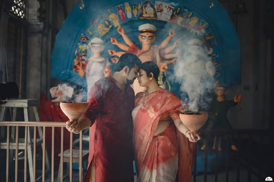 This romantic pre wedding couple dress perfectly matches the very Bong backdrop of Durga Moorti. The red and white saree of the bride, and the maroon kurta look of the groom just enhance the beauty of each other.